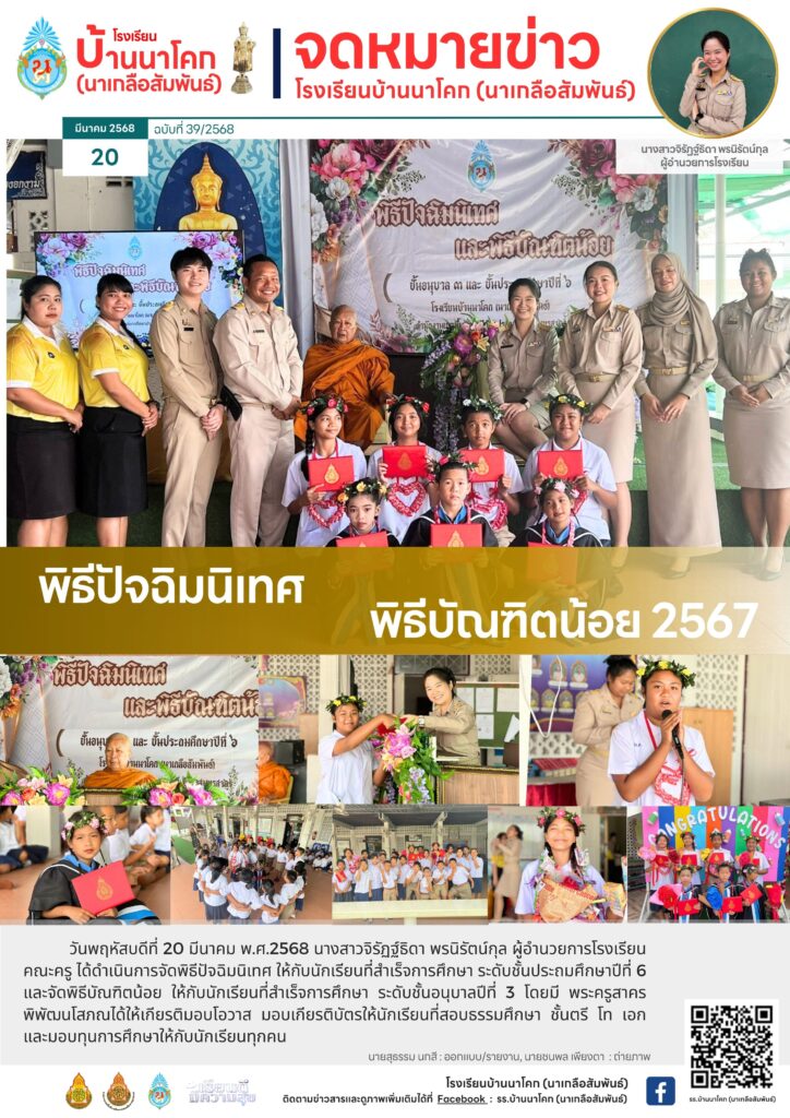 วันพฤหัสบดีที่ 20 มีนาคม พ.ศ.2568 นางสาวจิรัฏฐ์ธิดา พรนิรัตน์กุล ผู้อำนวยการโรงเรียน คณะครู ได้ดำเนินการจัดพิธีปัจฉิมนิเทศ ให้กับนักเรียนที่สำเร็จการศึกษา ระดับชั้นประถมศึกษาปีที่ 6 และจัดพิธีบัณฑิตน้อย ให้กับนักเรียนที่สำเร็จการศึกษา ระดับชั้นอนุบาลปีที่ 3 โดยมี พระครูสาครพิพัฒนโสภณได้ให้เกียรติมอบโอวาส มอบเกียรติบัตรให้นักเรียนที่สอบธรรมศึกษา ชั้นตรี โท เอก และมอบทุนการศึกษาให้กับนักเรียนทุกคน